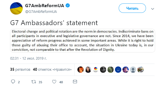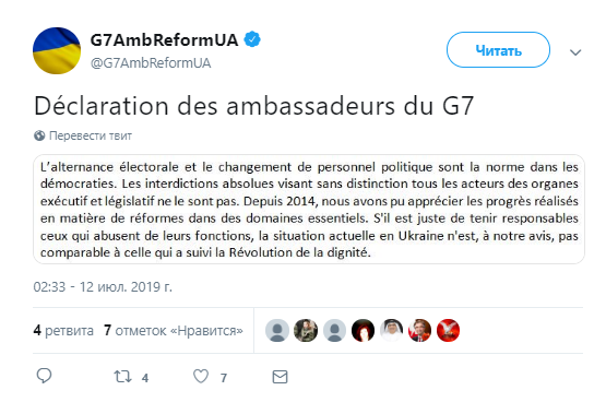 Послы стран G7 (Большой семерки) поддерживают привлечение к ответственности виновных в злоупотреблении властью, но отмечают отличие нынешней ситуации в Украине от постреволюционной. Об этом идет речь в заявлении послов G7 в Twitter.