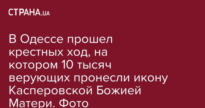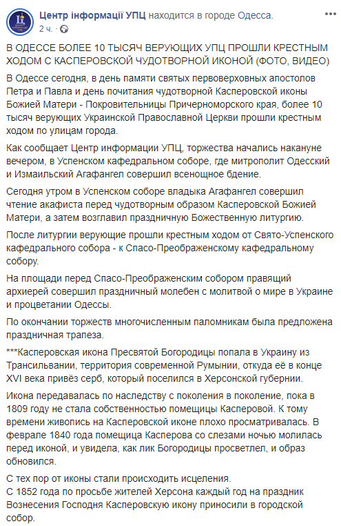 В пятницу, 12 июля, в Одессе в честь Дня памяти святых первоверховных апостолов Петра и Павла, а также в честь дня почитания чудотворной Касперовской иконы Божией Матери - Покровительницы Причерноморского края, более 10 тыс. верующих Украинской православной церкви (УПЦ) прошли по улицам города крестным ходом. Об этом сообщили в Центре информации УПЦ в Facebook.