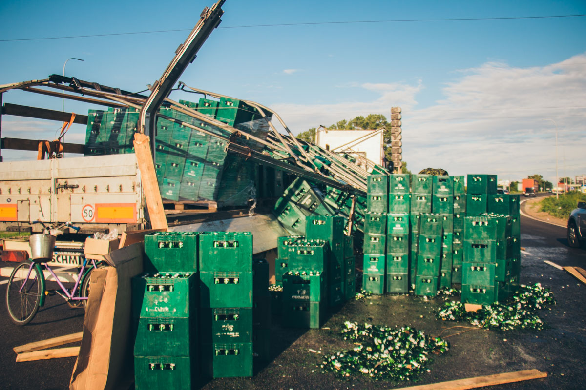 Грузовой автомобиль занесло около 15:00, когда он совершал поворот. Из прицепа стали сыпаться бутылки. Водитель фуры, направлявшийся из Киева в Харьков, предполагает, что груз был плохо закреплен. Ящики с целым товаром и битые бутылки буквально укрыли дорогу.