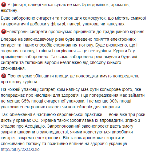 "Министерство здравоохранения Украины предлагает на законодательном уровне ввести определение электронных сигарет и ограничить продажу табака. Это поможет сохранить здоровье украинцев, а также приблизит наше законодательство к европейским стандартам", - отметила она.