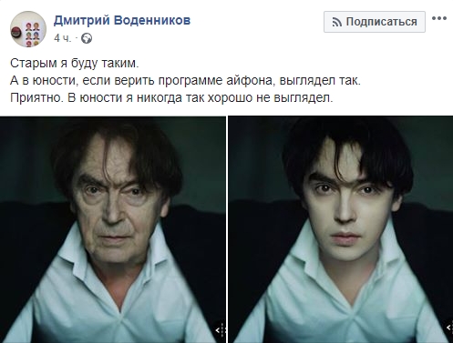 Известный российский поэт Дмитрий Воденников сам выложил свой состаренный снимок, отметив, что фото в молодости оказалось не совсем достоверным.