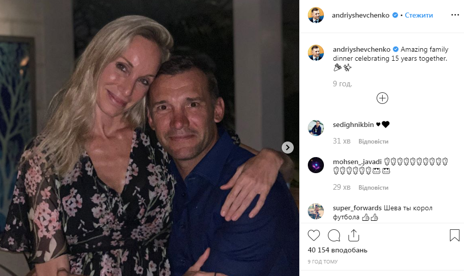 Об этой дате легендарный украинский футболист сообщил в своем Instagram, где опубликовал совместное фото с женой, которые подписал так: "Отличный ужин в кругу семьи. Отмечали 15 лет совместной жизни".