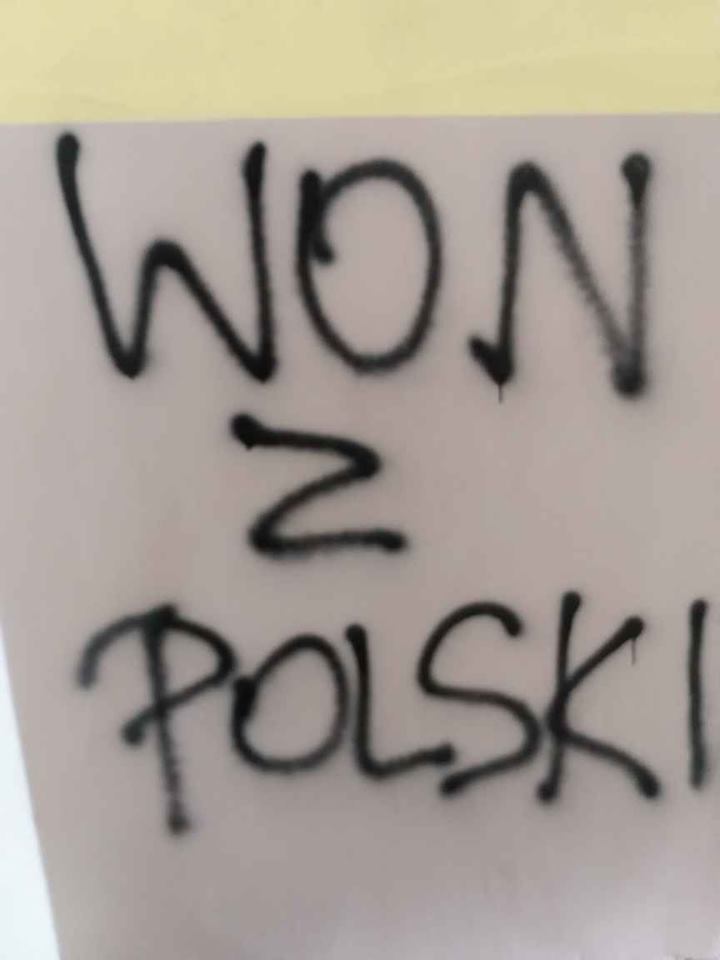 Также злоумышленники написали в подъезде оскорбительные слова, сообщает в Facebook польский Центр мониторинга проявлений расизма и ксенофобии.