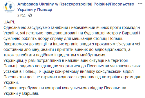 В свою очередь, украинские дипломаты осуждают нападение на жилище украинских строителей в Варшаве, которые легально трудоустроены на строительстве ветки метрополитена. "Однозначно осуждаем позорный и опасный поступок против граждан Украины, которые легально трудоустроены на строительстве метро в Варшаве и добросовестно делают доброе дело для жителей столицы Польши", - говорится в сообщении Посольства Украины в Польше в Facebook.  "Однозначно осуждаем позорный и опасный поступок против граждан Украины, которые легально трудоустроены на строительстве метро в Варшаве и добросовестно делают доброе дело для жителей столицы Польши", - подчеркнули украинские дипломаты. Украинцам, в случае попадания в чрезвычайные ситуации на территории Польши, рекомендуется безотлагательно обращаться в посольство или консульские учреждения в Польше. "В этом конкретном случае консульский отдел посольства до сих пор не получил ни одного обращения от пострадавших граждан Украины. Дело находится на контроле консульского отдела Посольства Украины в Варшаве", - говорится в сообщении.