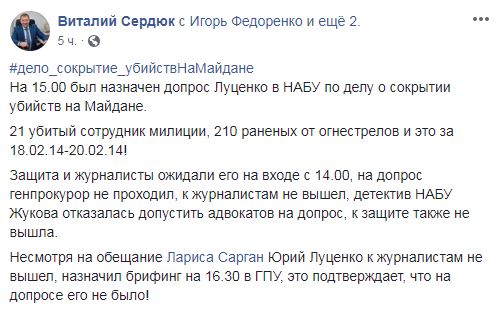 Об этом сегодня заявил адвокат Марины Семесюк, матери погибшего беркутовца Николая Семесюка, Александр Горошинский на совместной пресс-конференции с Виталием Сердюком, который также является адвокатом экс-президента Виктора Януковича. Видео своего заявления он разместил в Facebook. Между адвокатами, которые пытались получить сегодня доступ в помещение, где проводился допрос Луценко, и его пресс-секретарем Ларисой Сарган случилась словесная перепалка. Видео этого Сердюк также опубликовал на своей странице в Facebook.