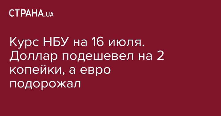 Во вторник, 16 июля, Национальный банк Украины установил новый курс для основных валют по отношению к гривне. По сравнению с предыдущим банковским днем доллар подешевел на 2 копейки. Об этом свидетельствуют данные на сайте регулятора.