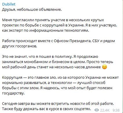 Дубилет в своем Telegram-канале сообщил, что его пригласили принять участие в нескольких проектах по борьбе с коррупцией в Украине, в которых он участвует как эксперт по информационным технологиям. "Это не значит, что я пошел в политику. Я продолжаю заниматься monobank и бизнесом в целом. Просто теперь мой рабочий день станет на несколько часов длиннее", - утверждает он. По словам Дубилета, Украина не может нормально развиваться из-за коррупции, а технологии - лучший способ борьбы с нею.
