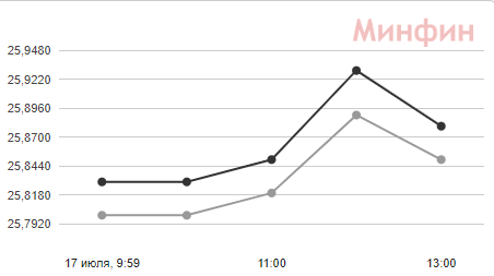 К 12:00 ситуация не слишком изменилась: 25,90 - покупка, 25,97 - продажа.