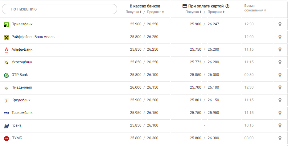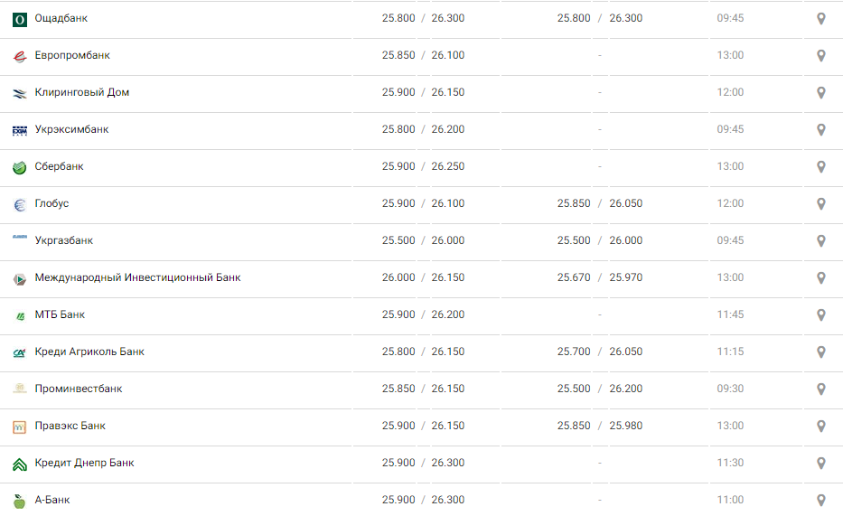 На 13:00 Приватбанк - 25,9/26,25; Райффайзен банк Аваль 25,8/26,25; Альфа банк доллар - 25,85/26,25; Укрсоцбанк 25,85/26,25; ОТР банк - 25,8/26,1; Укрсиббанк - 25,75/26,25, Ощадбанк - 25,8/26,3; курс доллара Пумб - 25,8/26,3.