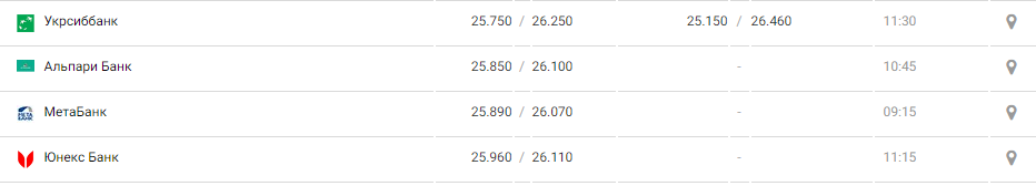 Курс доллара в банках с утра был такой: покупка в кассах банка - 25,6-25,85, продажа в кассах банка - 26-26,2.