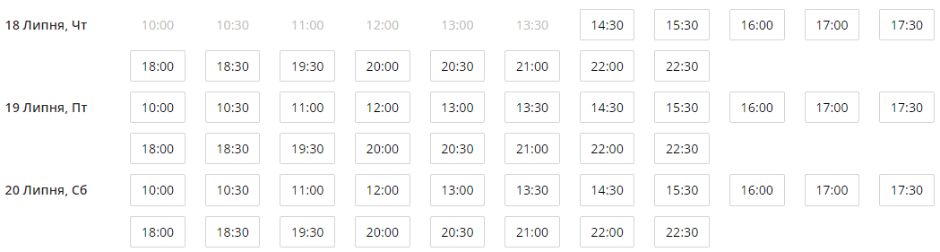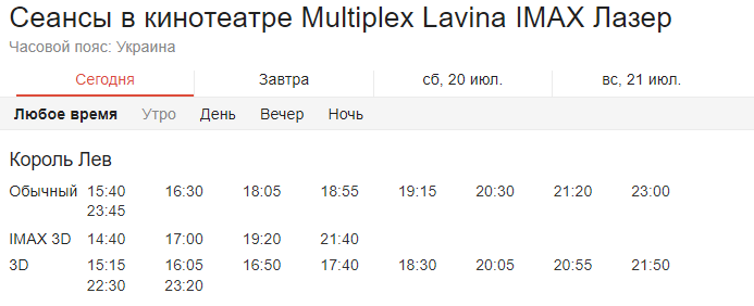 18 июля начала показа в кинотеатре - с 14:40. Стоимость билетов - от 100 до 200 грн. (до 18:55). Вечерние сеансы будут стоит дороже - в 19:15 за билеты Lux - 260 грн, в 19:20 - 220 грн, в 20:05 - от 120 грн., в 20:30 - от 110 грн. Сеансы оканчиваются в 23:45. После 23:00 билет будет стоить 60 грн.