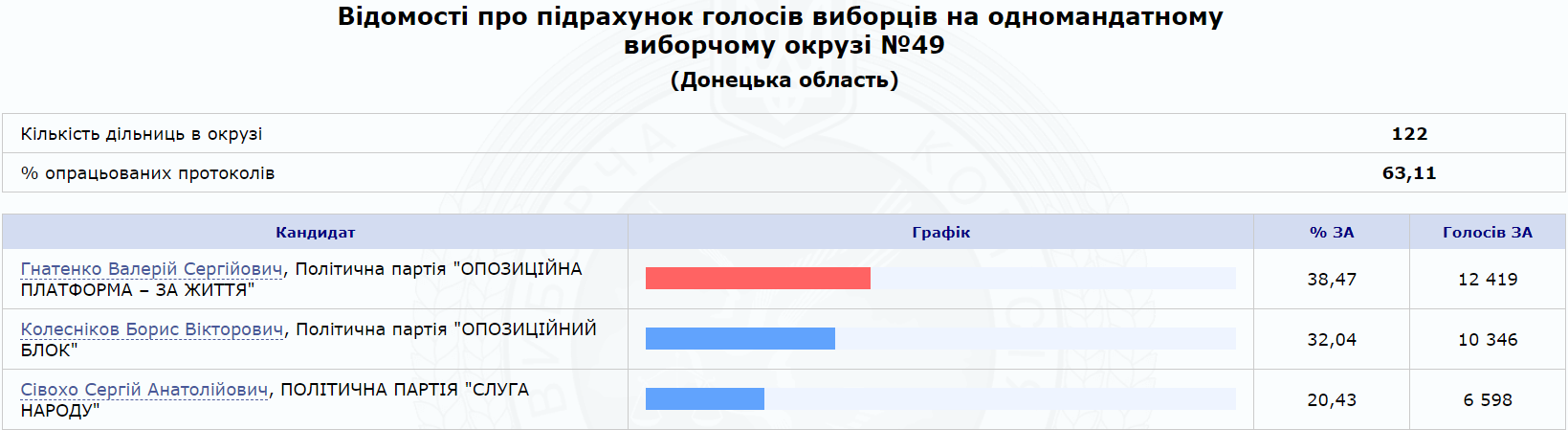 На 49 округе три интересных кандидата. Фаворит - мэр Дружковки Валерий Гнатенко, который идет от "Оппозиционной платформы". На втором месте - один из столпов "Оппоблока" Борис Колесников. На третьем - представитель "Слуги народа", бывший КВН-щик Сергей Сивохо.
