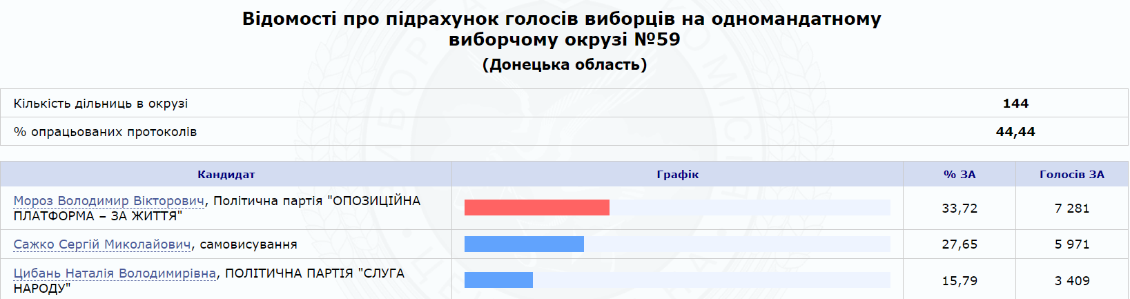 На 59 округе основная борьба развернулась между лидирующим здесь Владимиром Морозом ("Оппозиционная платформа") и самовыдвиженцем, нардепом Оппоблока Сергеем Сажко.