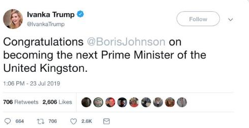 Так, Иванка поздравила Джонсона с назначением на пост "премьер-министра объединенного Кингстона" (United Kingston), вероятнее всего, имея ввиду Соединенное Королевство (United Kingdom).
