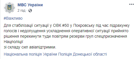 "Для стабилизации ситуации в ОИК № 50 в Покровске при подсчете голосов и недопущения осложнения оперативной обстановки принято решение перебросить туда по воздуху резервы групп спецназначения Нацполиции из состава сил авиаподдержки",- говорится в сообщении, на официальной странице МВД Украины в в соцсети Фейсбук во вторник вечером.