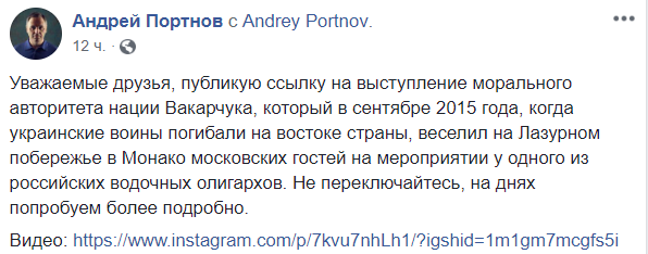 "Уважаемые друзья, публикую ссылку на выступление морального авторитета нации Вакарчука, который в сентябре 2015 года, когда украинские воины погибали на востоке страны, веселил на Лазурном побережье в Монако московских гостей на мероприятии у одного из российских водочных олигархов. Не переключайтесь, на днях попробуем более подробно", - заявил юрист.