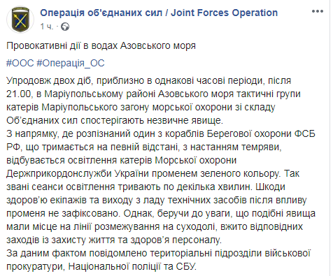 Интересно прозвучало заявление штаба ООС. После ареста судна в Измаиле украинские военные заявили, что корабли береговой охраны ФСБ в Азовском море светят на украинских моряков загадочными зелеными лучами
