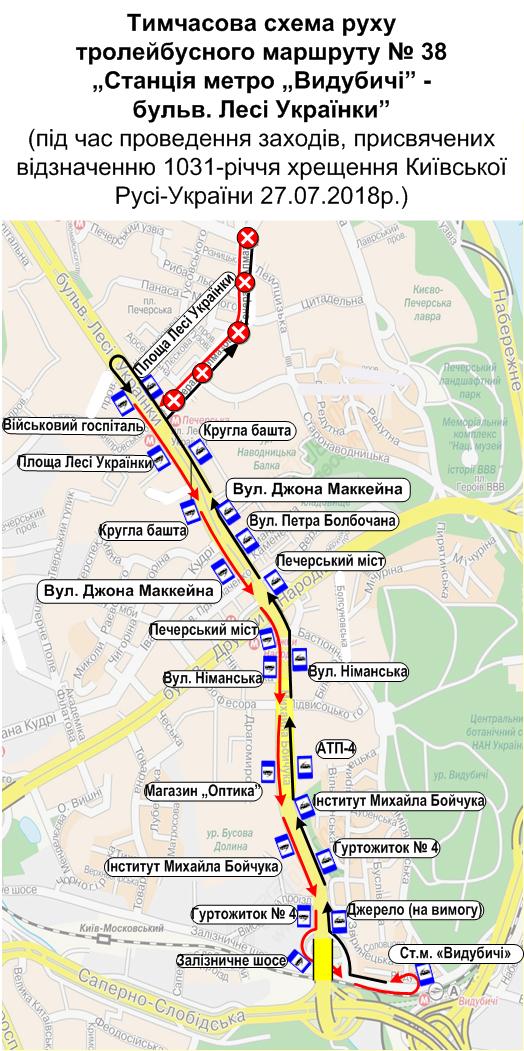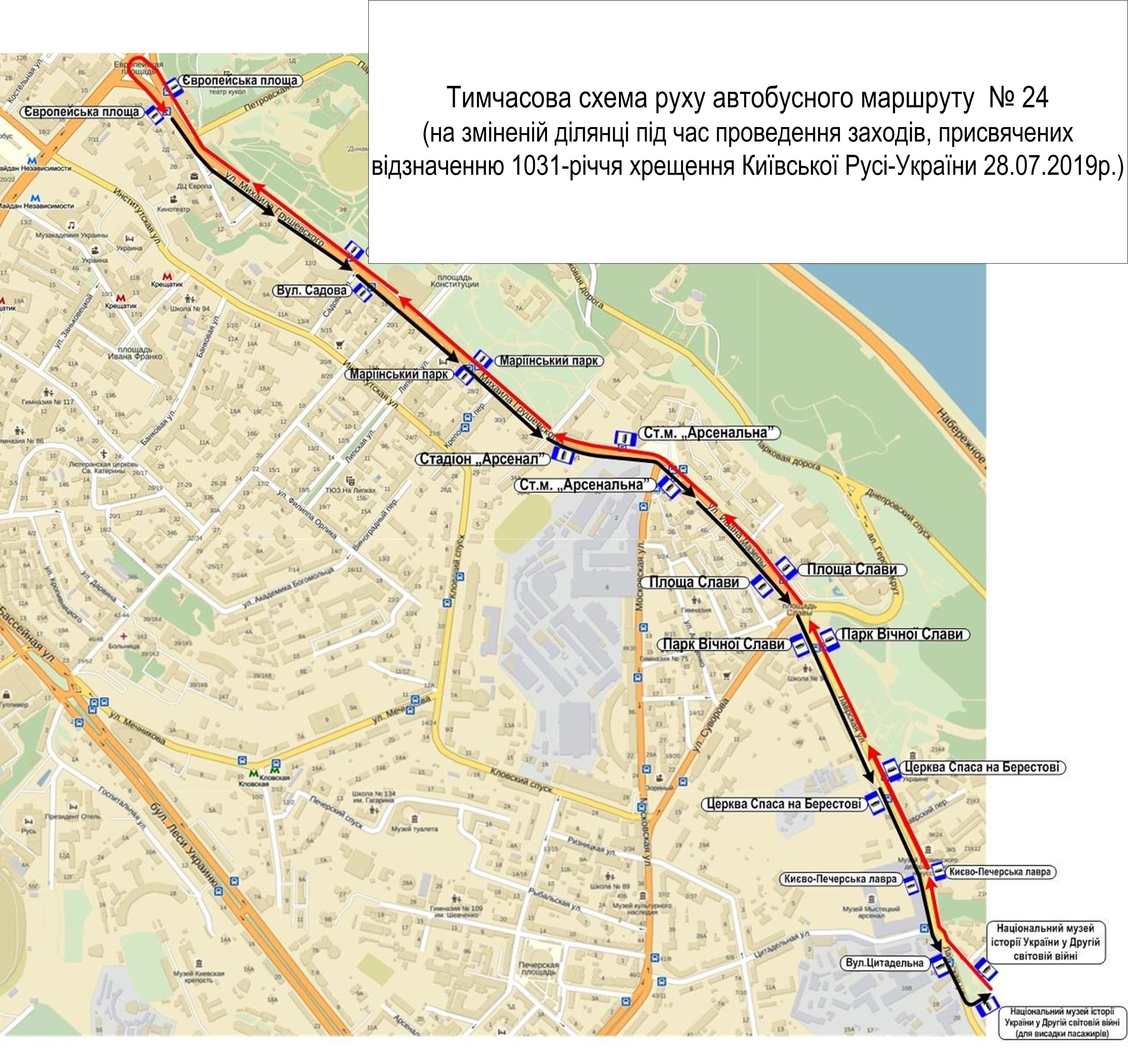 27 июля с 06:00 до 16:30 движение транспорта ограничено по улице Трехсвятительской (от площади Михайловской до Европейской), ул. Крещатик (от ул. Михайловской до Европейской площади), Владимирском спуске (от Почтовой площади до Европейской площади), Парковой дороге (от аллеи Героев Крут до ул. Михаила Грушевского), ул. Михаила Грушевского, ул. Ивана Мазепы (от Арсенальной площади до площади Славы), ул. Лаврской (от площади Славы до ул. Цитадельной).