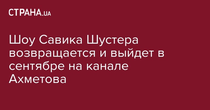"В сентябре на канале " Украина " стартует социально-политическое ток-шоу. Каждую пятницу Савик Шустер и гости студии будут разбираться в событиях, которые происходят в стране. Ток-шоу продлится три часа. Премьера - 6 сентября в 21.00", - написал на своей странице в ФБ главный редактор "Украины" Юрий Сугак.