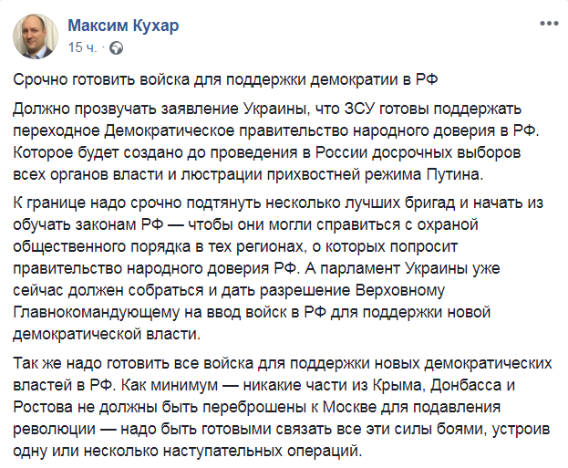 По словам журналиста, Украина должна заявить, что ее вооруженные силы готовы поддержать "переходное Демократическое правительство народного доверия в РФ". По мнению Кухаря, такое правительство будет создано до проведения в России досрочных выборов всех органов власти и люстрации "прихвостней режима Путина".