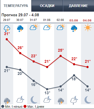 Прогноз Мeteoprog.ua сообщает, что с +31 в понедельник температура скатится до +21 в течение недели. Дождь в Киеве обещают 29-30 июля, а также 3 августа. Воскресенье, 4 августа, по данным этого ресурса, будет солнечным - воздух прогреется до +21.