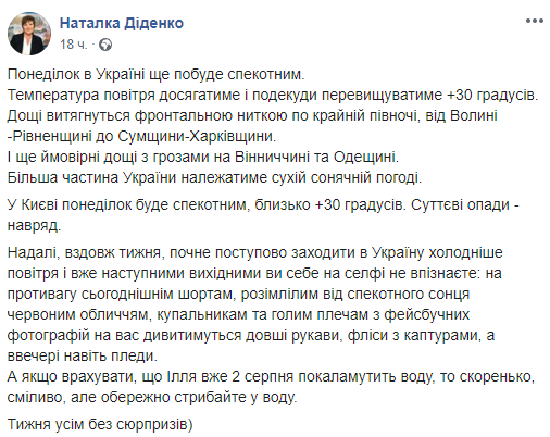 Синоптик ресурса Opogode Наталья Диденко сообщила, что понедельник в Киеве еще будет жарким. Воздух прогреется до +30, а в некоторых регионах страны и выше. Дожди 29 июля вытянутся ниткой вдоль севера Украины - Волынской, Ровенской, Сумской и Харьковской областях. Также в понедельник вероятны осадки в Винницкой и Одесской областях.