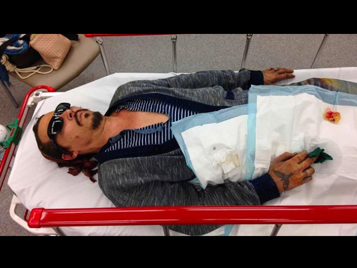 Теперь появился снимок раненого супругой Деппа. На фото звезда лежит на носилках в темных очках, его палец обернут тканью, а на щеке видно пятно.