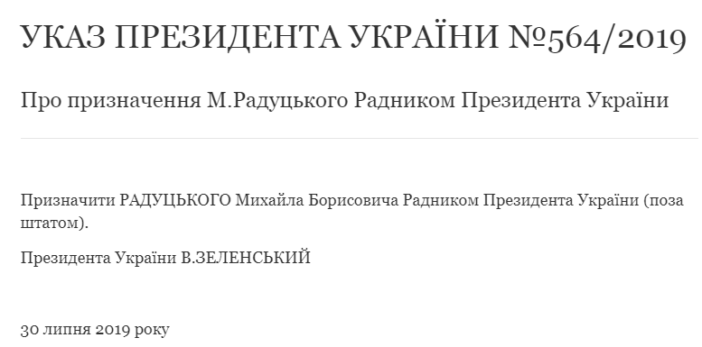 Соответствующий указ №564/2019 главы государства подписал во вторник, 30 июля. Он уже опубликован пресс-службой.