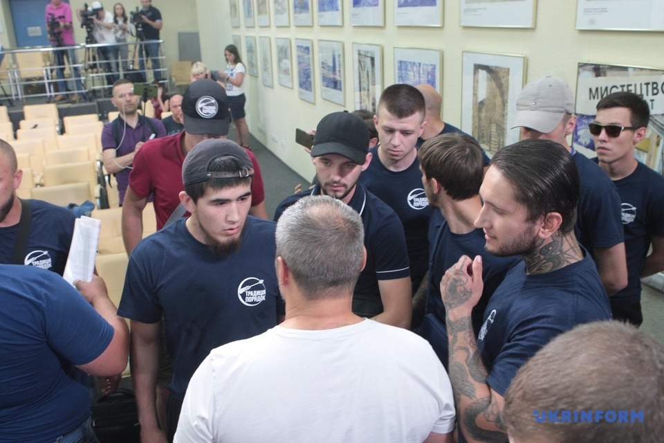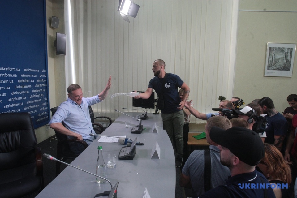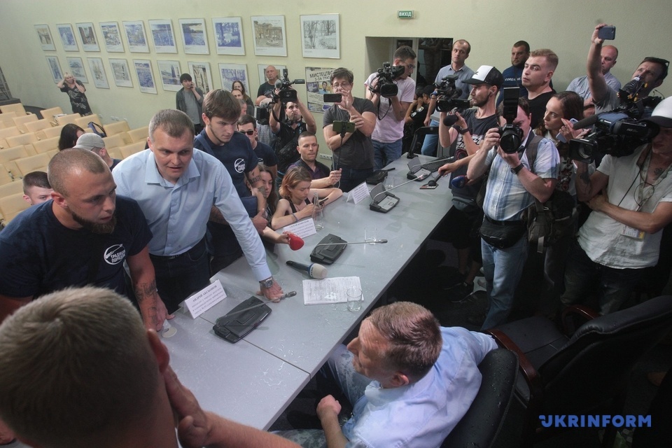 Напомним, во вторник, 30 июля, в Укринформе молодчики в футболках организации "Традиция и порядок" сорвали пресс-конференцию, посвященную возможным фальсификациям в округе №50 в Покровске в Донецкой области. В частности, они во время пресс-конференции выбили входную дверь в зал Укринформа и вбежали с криками "Сепаратист Аксенов!", "Ганьба", после чего облили водой и забросали яйцами кандидата в депутаты Андрея Аксенова.