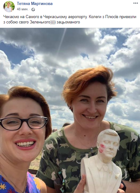 По состоянию на 13:00 Владимира Зеленского в Черкасском аэропорту уже ожидали представители СМИ. Об этом в Facebook написала журналистка Татьяна Мартынова. Она выложила снимок с коллегой, на которой они позируют с бюстом Владимира Зеленского.