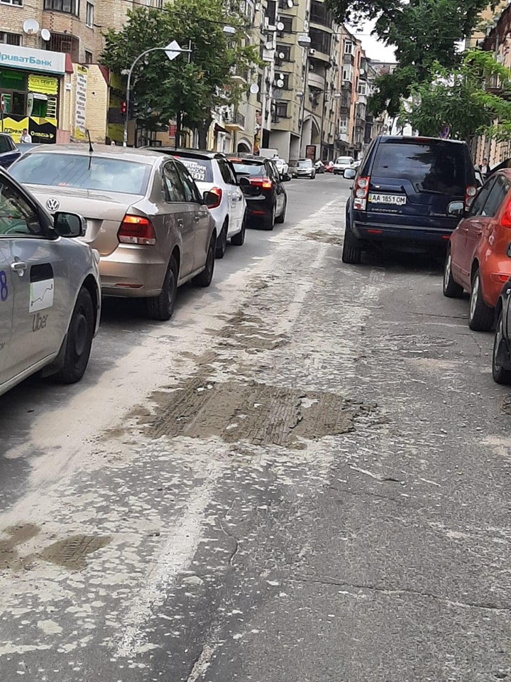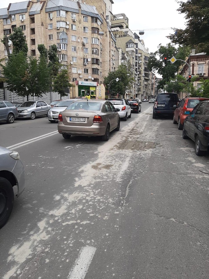 "Грузовой автомобиль разлив бетон более чем 800 метров улицы Бульварно-Кудрявской (от ул.Дмитриевской до дома №15). Факт зафиксировал неравнодушный водитель и сразу сообщил в ДЭУ Шевченковского района КК "Киевавтодор", - говорится в сообщении.