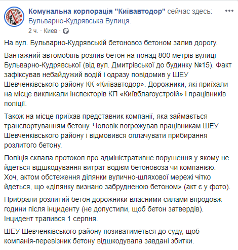 Как отмечается, приехавшие на место дорожники вызвали инспекторов КП "Киевблагоустройство" и работников полиции. Также на место приехал представитель компании, которая занимается транспортировкой бетона.