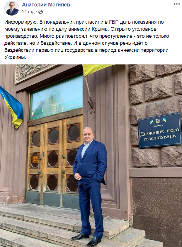 Об этом сам Анатолий Могилев написал в Facebook и выложил фото, где он стоит на пороге ГБР.