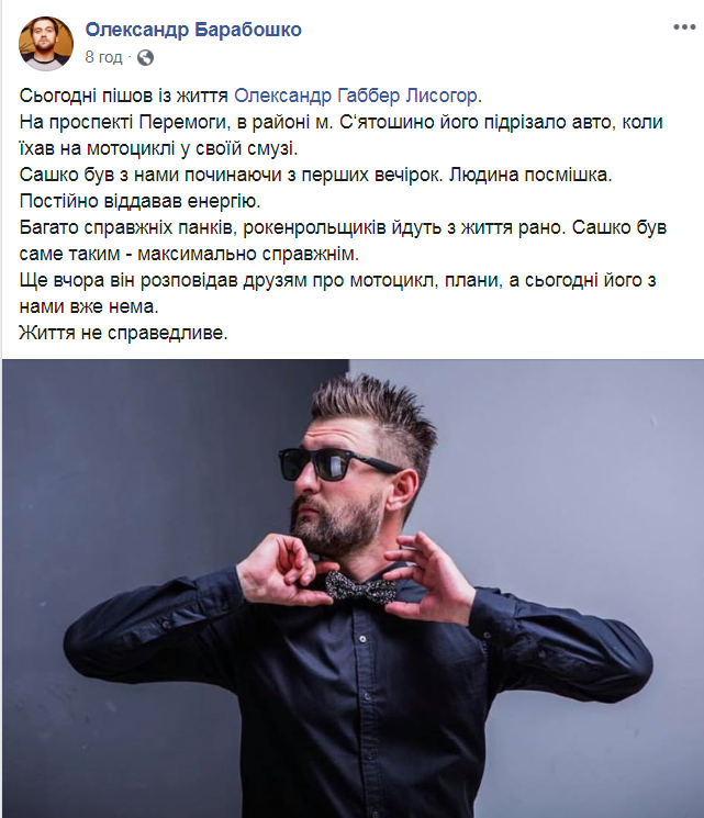 "Саша был с нами начиная с первых вечеринок. Человек улыбка. Постоянно отдавал энергию. Многие настоящие панки, рок-н-рольщики уходят из жизни рано. Саша был именно таким - максимально настоящим. Еще вчера он рассказывал друзьям о мотоцикле, планы, а сегодня его с нами уже нет. Жизнь несправедлива", - написал Александр Барабошко.
