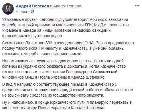 Также мы писали о том, что Портнов выиграл суд у МИД и Посольства Украины в Канаде.