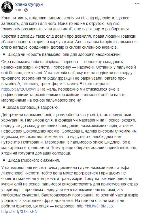 Глава Минздрава Ульяна Супрун развеяла мифы, связанные с пальмовым маслом. Из-за его дешевизны этот продукт добавляют во множество продуктов питания - особенно в сладости и фастфуд.