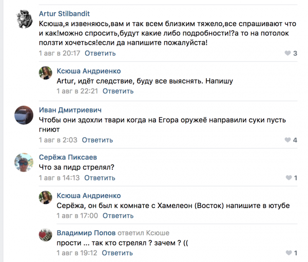 При этом в комментариях к этому посту, очевидно, супруга Егора Ксения Андриенко написала, что к убийству, возможно, имеет отношение некий Хамелеон из батальона "Восток", который находился с ним комнате. Боевик с таким позывным действительно служит в формировании "Восток".