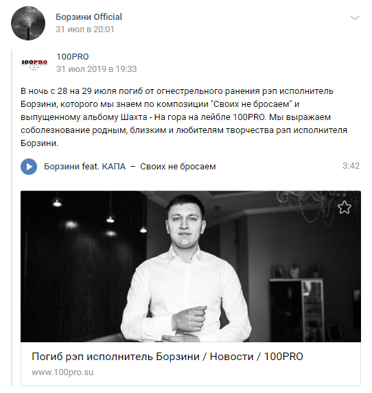 И уже вечером 31 июля появилось более подробное сообщение о смерти Егора: "В ночь с 28 на 29 июля погиб от огнестрельного ранения рэп-исполнитель Борзини, которого мы знаем по композиции "Своих не бросаем" и выпущенному альбому "Шахта - На гора" на лейбле 100PRO. Мы выражаем соболезнование родным, близким и любителям творчества рэп-исполнителя Борзини".
