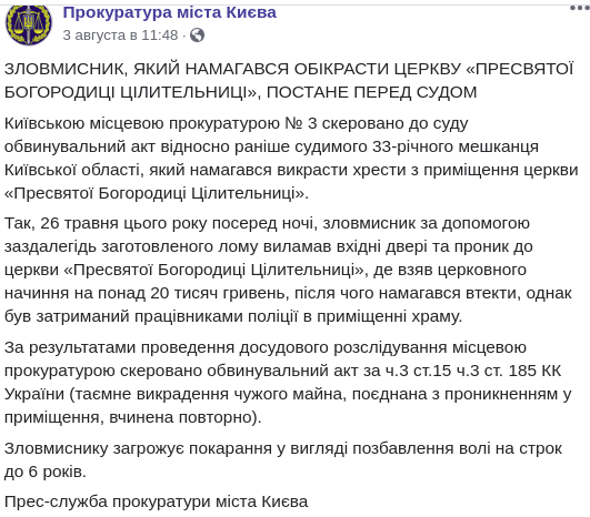 Киевская городская прокуратура направила в суд обвинительный акт в отношении ранее судимого 33-летнего жителя Киевской области, который пытался похитить кресты из помещения церкви "Пресвятой Богородицы Целительницы". Об этом сообщает прес-служба прокуратуры Киева.