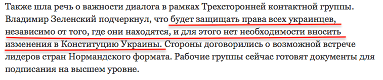 Киев: "Владимир Зеленский подчеркнул, что будет защищать права всех украинцев, независимо от того, где они находятся, и для этого нет необходимости вносить изменения в Конституцию Украины". Буквально вчера это же подтвердил олигарх Игорь Коломойский, которого считают близким к Зеленскому и его Офису.