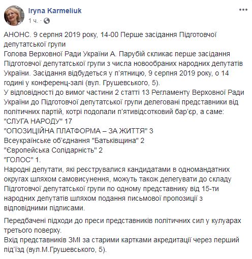 Спикер приглашает новых избранников на 14:00 пятницы в конференц-зал на Грушевского, 5. По регламенту, в подготовительную депутатскую группу делегированы представители от партий, преодолевших 5%-й барьер, а именно: от "Слуги народа" – 17, от "Оппозиционного платформы – За жизнь" – 3, от "Батькивщины" – 2, от "Европейской солидарности" – 2, от "Голоса" – 1 человек.