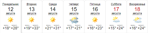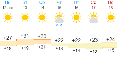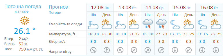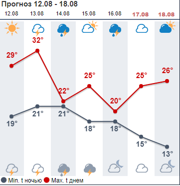Прогноз Мeteoprog.ua показывает, что в понедельник и вторник воздух прогреется до +29...+32. 13 августа возможна гроза. В среду, 14 августа, температура днем опустится до +22, обещают грозу. Погодный ресурс обещает дождь и в пятницу, 16 августа. Погода на выходных такая: днем +25...+26, переменная облачность без осадков.