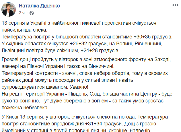 Синоптик ресурса Opogode Наталья Диденко сообщила, что с 13 августа в Украину придет сильная жара. В Киеве температура воздуха достигнет +30...+35 градусов. Во вторник, 13 августа, в столице возможен дождь с грозой - во второй половине дня или вечером.