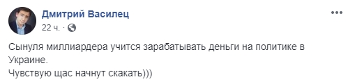 Журналист Дмитрий Василец: "Сынуля миллиардера учится зарабатывать деньги на политике в Украине. Чувствую щас начнут скакать".