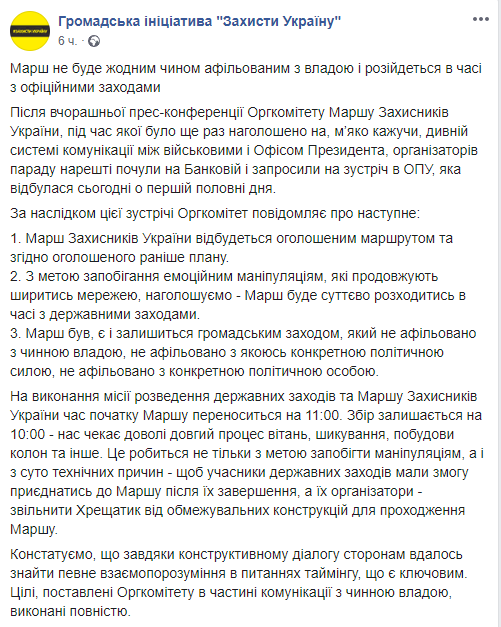"Во исполнение миссии разведения государственных мероприятий и Марша защитников Украины время начала марша переносится на 11:00. Сбор остается на 10:00 - нас ждет достаточно долгий процесс поздравлений, построения, построения колонн и прочее. Это делается не только с целью предотвратить манипуляции, а и по сугубо техническим причинам - чтобы участники государственных мероприятий имели возможность присоединиться к маршу после их завершения, а их организаторы - освободить Крещатик от ограничительных конструкций для прохождения марша", - говорится в сообщении.