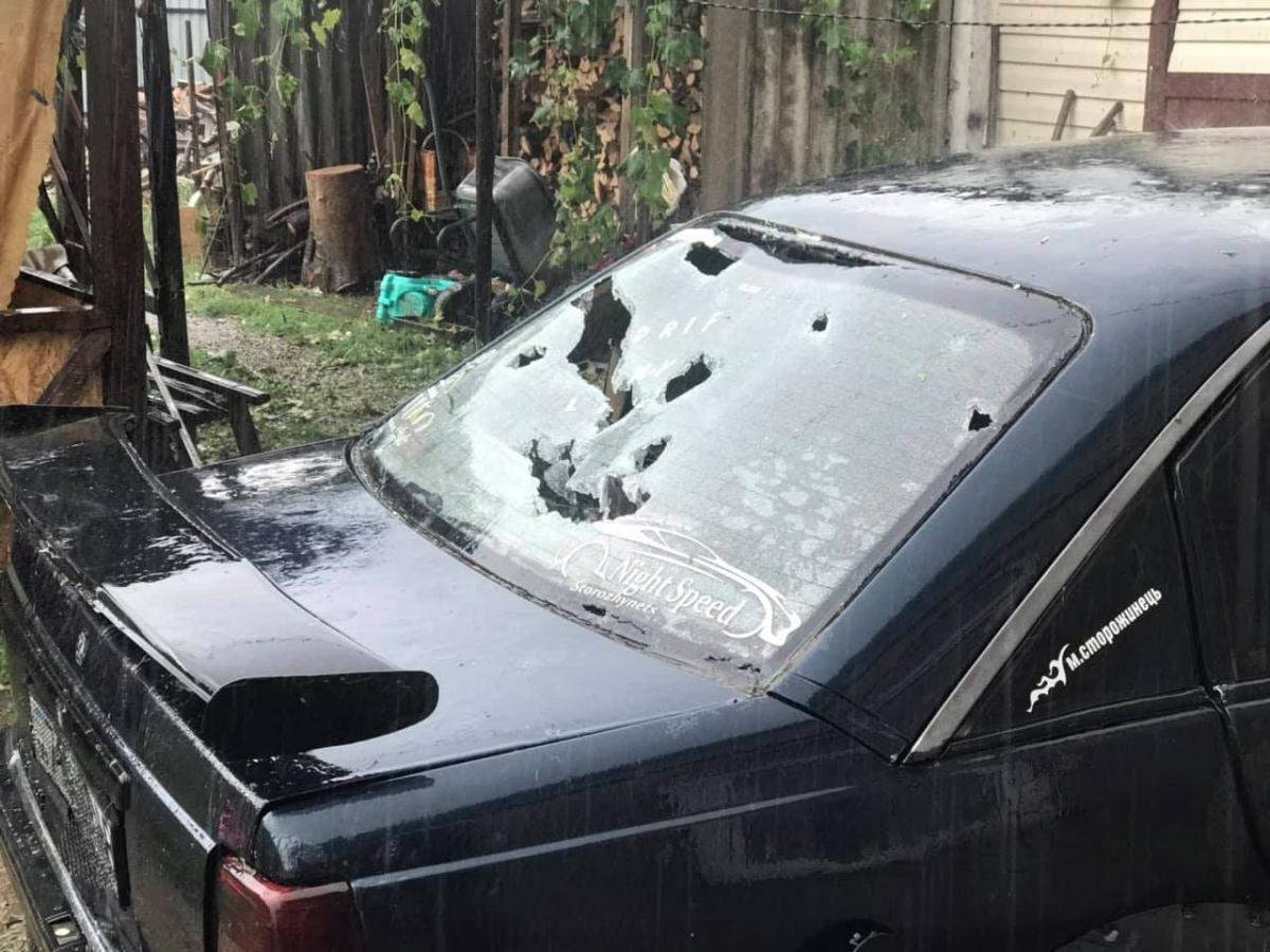 Как сообщили местные жители, град размером с куриное яйцо побил лобовое стекло автомобиля, побил стекла жилых домов, а также повредил кровельное покрытие ряда зданий города.