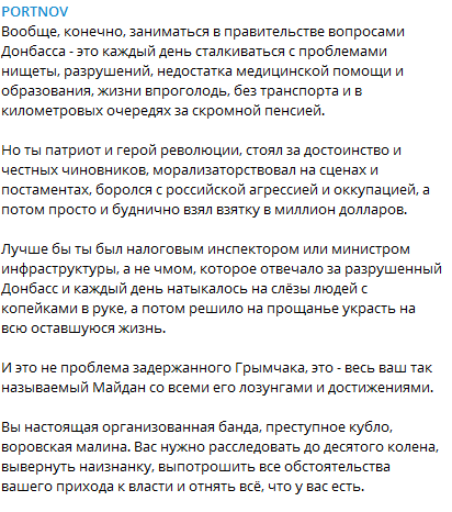Вы настоящая организованная банда, преступное кубло, воровская малина. Вас нужно расследовать до десятого колена, вывернуть наизнанку, выпотрошить все обстоятельства вашего прихода к власти и отнять всё, что у вас есть", - написал юрист Андрей Портнов.
