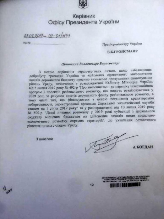 На своей странице в Facebook руководитель Львовской областной администрации Александр Ганущин опубликовал копию письма за подписью руководителя Офиса президента Андрея Богдана, в котором тот просит приостановить расходы по распределению части субвенции на социально-экономическое развитие и ГФРР до формирования нового состава правительства.