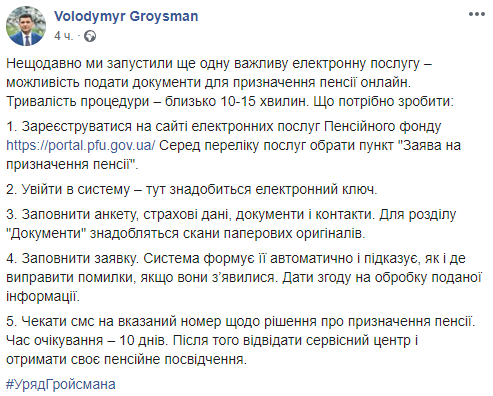 Владимир Гройсман, сообщая о запуске оформления пенсий онлайн, подчеркнул, что это заслуга "уряда Гройсмана".