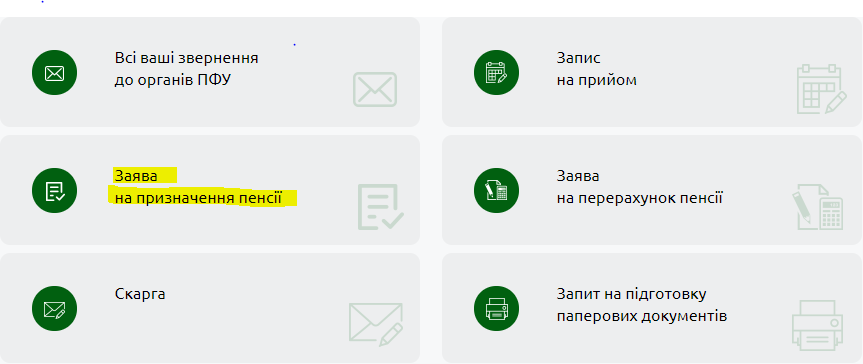 2. Если вписать ЭПЦ и зарегистрироваться на сайте получилось, нужно найти в перечне услуг графу "Заявление на назначение пенсий". Кликнуть на нее.